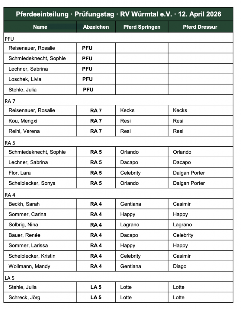 Insgesamt nahmen 17 Prüflinge an der diesjährigen Abzeichenprüfung teil. 14 Reitschülerinnen und Reitschüler aus unserer Reitschule stellten sich den Prüfungen – dazu kamen 2 externe Gäste vom ARC München (Renée Bauer und Lara Flor), die herzlich willkommen geheißen wurden und auf unseren Schulpferden starteten. 4 Privatreiterinnen (Rosalie Reisenauer auf Kecks, Carina und Larissa Sommer auf Happy sowie Nina Solbrig auf Lagrano) Einsteller des RV Würmtal brachten ihre eigenen Pferde mit. Die übrigen Starts wurden auf Schulpferden des RV Würmtal absolviert – ein Beleg für die Qualität und Vielseitigkeit unseres Schulbetriebs.